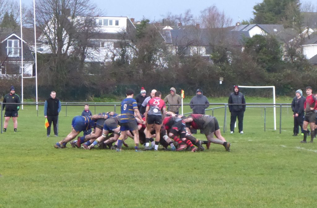 The moment when the game was won came on 35 minutes when the ball from a scrum under pressure just inside their own half was picked up by scrum-half Galsworthy who somehow avoided the Glyncoch flanker’s initial tackle before slipping under three further attempted tackles to score a try, much to the delight of his teammates and the chilled spectators. The conversion by Crimp was unsuccessful.