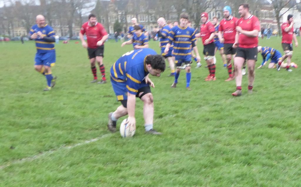 Half time saw the introduction of Mike Jones at prop and Chandler at hooker for Nathan Harris and O’Brian but the changes did not affect the scrummaging which remained strong throughout. And it was from an initial solid scrum that saw the ball released by Galsworthy to allow half back partner Crimp carry the ball into contact 10m out from the tryline. The forwards were in support and Reynolds and Smart set up a ruck. A quick possession found Halliday on the right unmarked and he strolled over for a try.