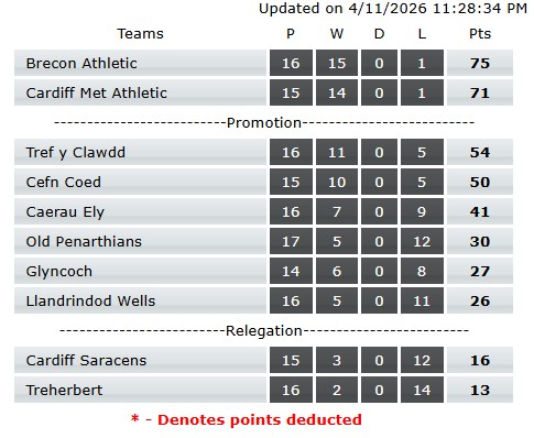 The win and bonus point for scoring four tries puts the team on 30 league points with five wins and into sixth place in the 10-team league. With two teams to be relegated, the bottom team Treherbert are on 13 points with two games remaining and cannot catch the Old Pens and the other team currently in the other relegation place, Cardiff Saracens, have three games remaining and sit on 16 points. Mathematically Saracens could escape if they were to win all their remaining games with a bonus point in each but one of their fixtures is against table toppers Brecon Athletic who are looking to secure the league title. These results would have no effect on the Old Pens if they could take something out of their last fixture of the season away to Llandrindod Wells, a side they recently defeated at Cwrt-y-vil.
